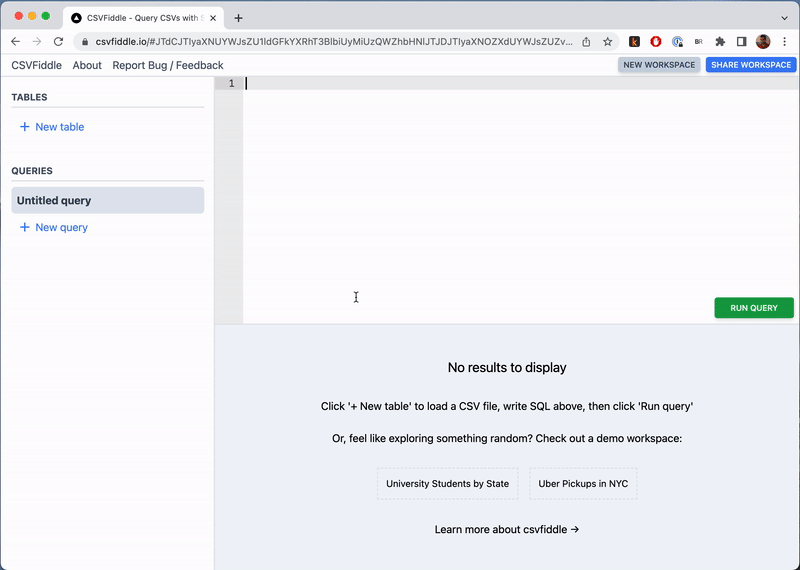 What I want is an experience resembling the BigQuery SQL Editor, but optimized for quick import of CSV data. I want to generate links to share my queries with anyone on the Internet.