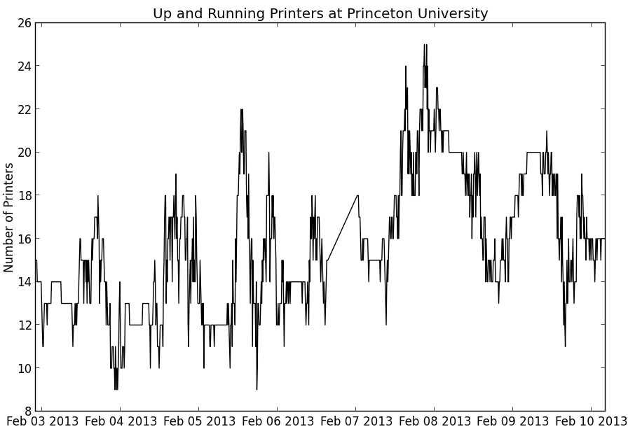 Here’s a plot of the number of printers reported to be “Up and Running” across campus over that week.