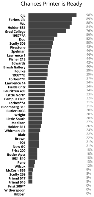 The above graph shows the ranking of campus printers based on the percentage of observations in which they reported to be “Up and Running”. It shouldn’t come as a surprise that the popular Wilcox printers rank low on the list. However, it seems the printer in the nearby Wu library was just third on the list.