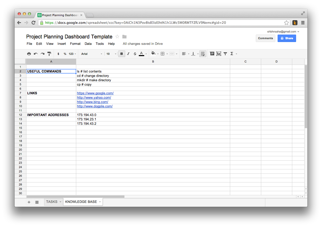 The goal of the second sheet is to share knowledge that may be needed by other people later in the project. Commands, links, addresses, passwords all go here. The key here is to keep the sections meaningfully organized. Think of it like a “corporate knowledge-sharing wiki” for small projects.