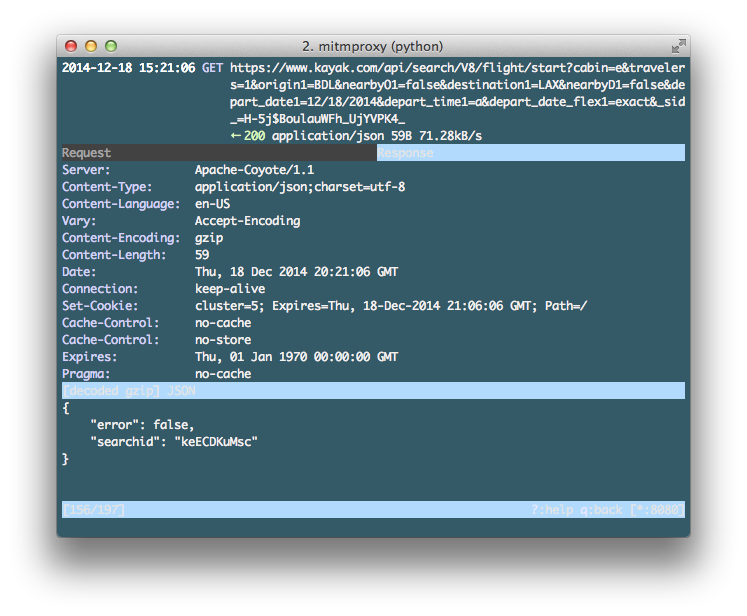 In this post, I’ll explain how I used mitmproxy– a popular network analysis tool– to reverse-engineer the Kayak mobile app. The result is an understanding of important server endpoints that can be accessed programmatically for personal use.