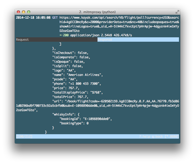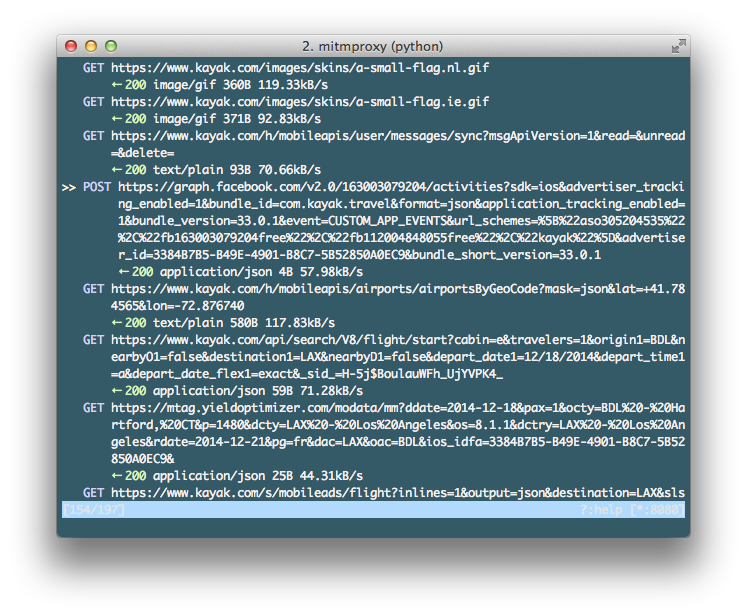 Having saved the network activity to a file, we can browse the results in a beautiful curses interface with mitmproxy -r kayak_flows.out.
