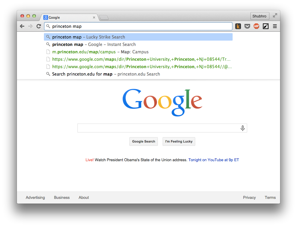 Sometimes it screws up: ‘obama birthday’ takes me to The Washington Times. To easily return to search results, I created a Chrome extension called Lucky Strike. The extension installs a button to pull up the search results page for your most recent query. You can install it for yourself on the Chrome Web Store. If you don’t mind retyping queries, you can add ‘I’m Feeling Lucky’ to your search bar the plain vanilla way.